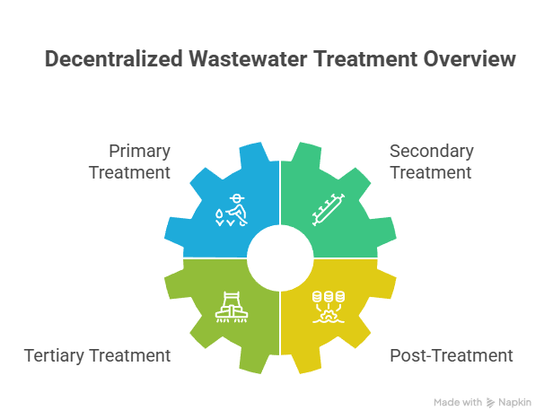Decentralized wastewater treatment requires several well-designed treatment stages. Each stage plays a vital role to purify wastewater before it becomes safe to discharge or reuse.