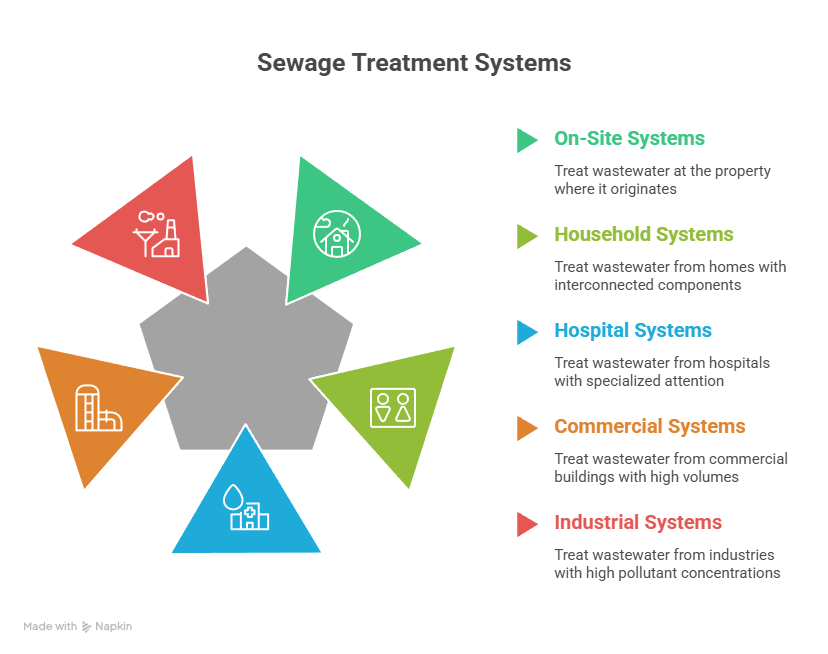 Multiple system categories exist to handle different wastewater scenarios. Each one is designed for specific property types and treatment requirements.