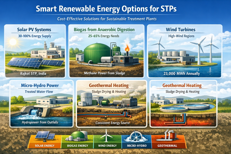 Traditional STPs consume substantial power through energy-heavy processes like aeration and pumping. These processes make them perfect candidates for renewable solutions. The options are diverse – from Solar PV systems and biogas from anaerobic digestion to wind turbines, micro-hydro installations, and geothermal heating. Each option’s viability depends on site conditions and available resources.